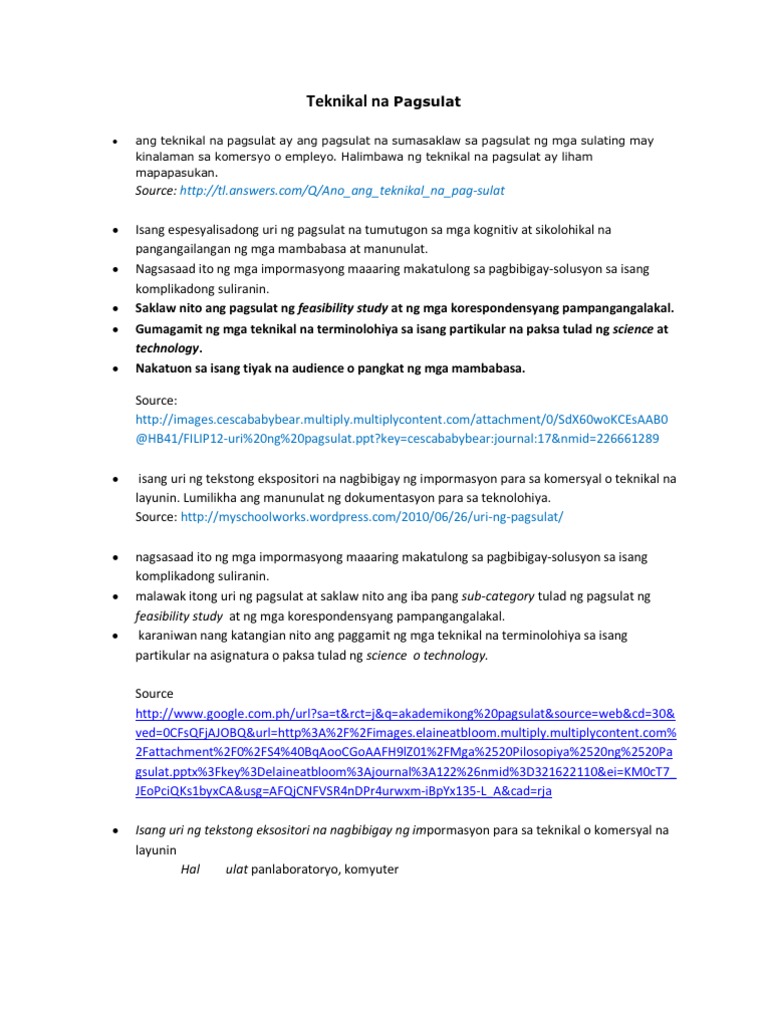 Kahulugan ng teknikal -bokasyonal na sulatin. 1 3 Isang espesyalisadong anyo ng komunikasyon na karaniwang inihahalintulad sa iba pang uri ng pagsulat bagaman ito ay may tiyak na awdiyens layunin estilo pormat sitwasyon nilalaman at gamit na siyang pangunahing elemento ng komunikasyong teknikal. Upang magbigay ng kailangang impormasyon 3.