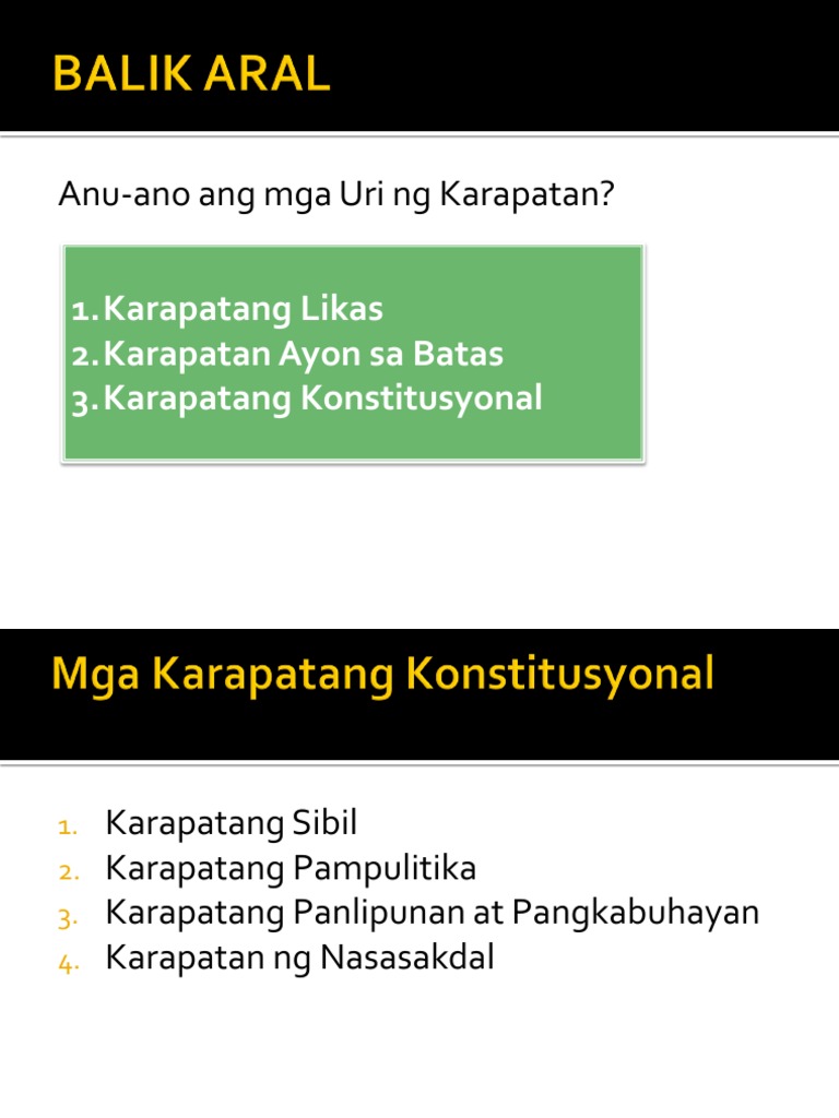 Alinsunod sa mga bats ng Filipinas may dalawang uri ito. Dahil dito ay kasunduang nabuo lamang ng samahang Triple Entente dLahat ng nabanggit _____ 5. 4 Karapatang mabuhay maging malaya at magkaroon ng seguridad 4 Karapatan sa pantay na paglilitis at pagdinig 4 Kalayaan sa pagpapahayag at mapayapang pagtitipon 4 Karapatang bumoto 4 Karapatang.