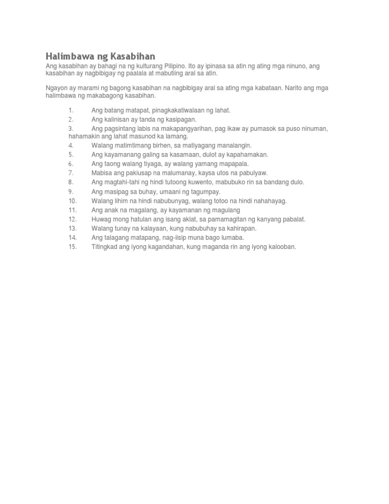 KASABIHAN TAGALOG Sa paksang ito tatalakayin natin ang ibat ibang halimbawa ng mga kasabihang Filipino. Ang ibig sabihin ng kasabihan ay isang koleksyon ng mga maikling pahayag na may kaugnayan sa isang partikular na tao. Lee mas mga kasabihan ng mga tanyag na tao tungkol sa bayan komiks book na may image pagmamahal sa bayan tula tungkol sa mga bayaning pilipino artikolo ng mga bayani talambuhay ng.