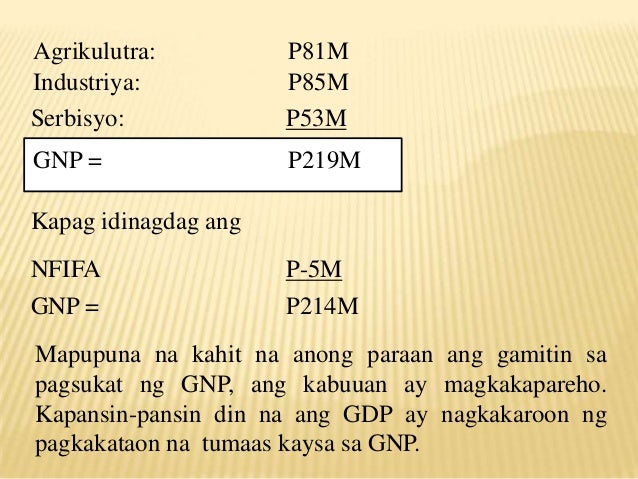 Sa pagsukat ng GNPGNI sa paraang ito kailangan munang alamin ang GDP at saka idagdag ang net factor income. Kasama sa bilang ang kabuuang produktong domestic domestic ng bansa kasama ang kita na natatanggap mula sa mga mapagkukunan sa ibang bansa. GNP -Gross National Product GDP -Gross Domestic Product.