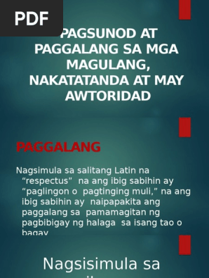 PAGGALANG SA MGA MAGULANG NAKATATANDA AT MAY AWTORIDAD PAGGALANG Nagsimula sa salitang Latin na respectus na ang ibig sabihin ay paglingon o pagtinging muli na ang ibig sabihin ay naipapakita ang paggalang sa pamamagitan ng pagbibigay ng halaga sa isang tao o Nagsisimula sa pamilya ang kakayahang kumilala sa halaga. Paano natin dapat gawin ang kalooban ng Diyos upang makamit ang pagsang-ayon ng Diyos. Lagi mong ipanalangin ang mga taong may awtoridad na ikaw ay pamahalaan.