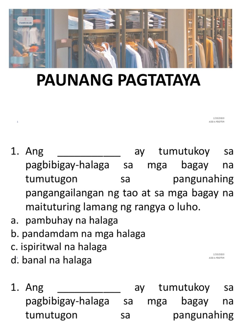 Ano ang kahulugan ng padamdam na halaga. A at b D. Halaga ekonomika isang sukat ng pakinabang na maaring makuha mula sa mga produkto o serbisyo Presyo ang kantidad ng bayad o kompensasyon na binigay ng isang partido sa isa pa makakuha ng produkto o serbisyon. Ang bokasyon ay kalagayan o gawain na naayon sa plano ng Diyos sa atin C.