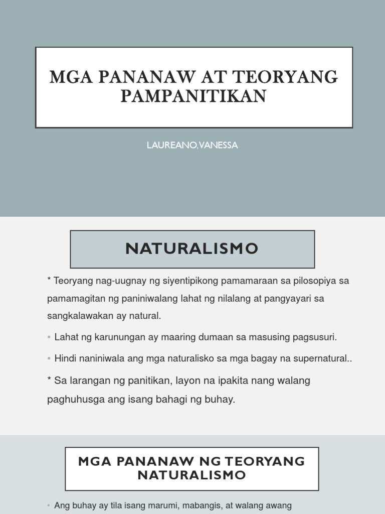 Teoryang naturalismoRICA LYZEL PASQUIN BSE12Ano nga ba ang kahulugan ng NaturalismoAno nga ba ang kahulugan ng NaturalismoItoy Teoryang Pampanitikan na naniniwalang walang malayang kagustuhan ang isang tao dahil ang kanyang buhay ay hinuhubog lamang ng kanyang herediti at kapaligiranTeoryang NaturalismoAng buhay ay tila isang marumi mabangis at walang awang kagubatanAng indibidwal ay produkto ng kanyang kapaligiran at pinanggalinganMahina ang hawak ng. Ginagamit din ito upang ilarawan ang isang bagay na mahirap makamit sa pagsasanay halimbawa Ang iyong mga ideya upang mapabuti ang sitwasyon sa bansa ay purong teorya. Ipinapalagay na ang akda ay may kapangyarihang maglahad o magpahayag hindi lamang ng literal na katotohanan kundi mga panghabambuhay at unibersal na mga katotohanan at mga di mapapawing mga pagpapahalaga at kaasalan.