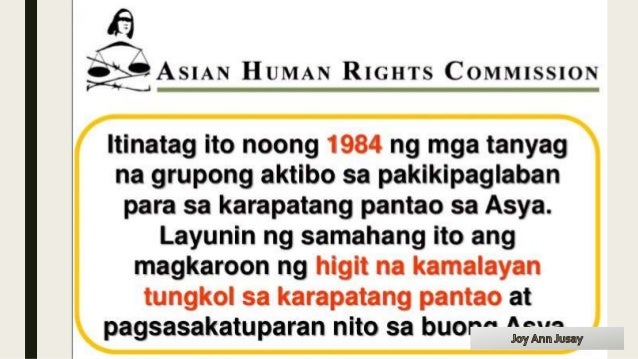 Ang Universal Declaration of Human Rights UDHR ay isa sa mahalagang dokumentong naglalahad ng mga karapatang pantao ng bawat indibiduwalna may kaugnayan sa bawat aspekto ng buhay ng tao. October 18 2016 Uncategorized. Wala pa ring katarungan para sa mga biktima ng Maguindanao Massacre noong 2009 kung saan nasawi ang 58 na katao na 38 sa mga ito ay mamamahayag o mga miyembro ng media.
